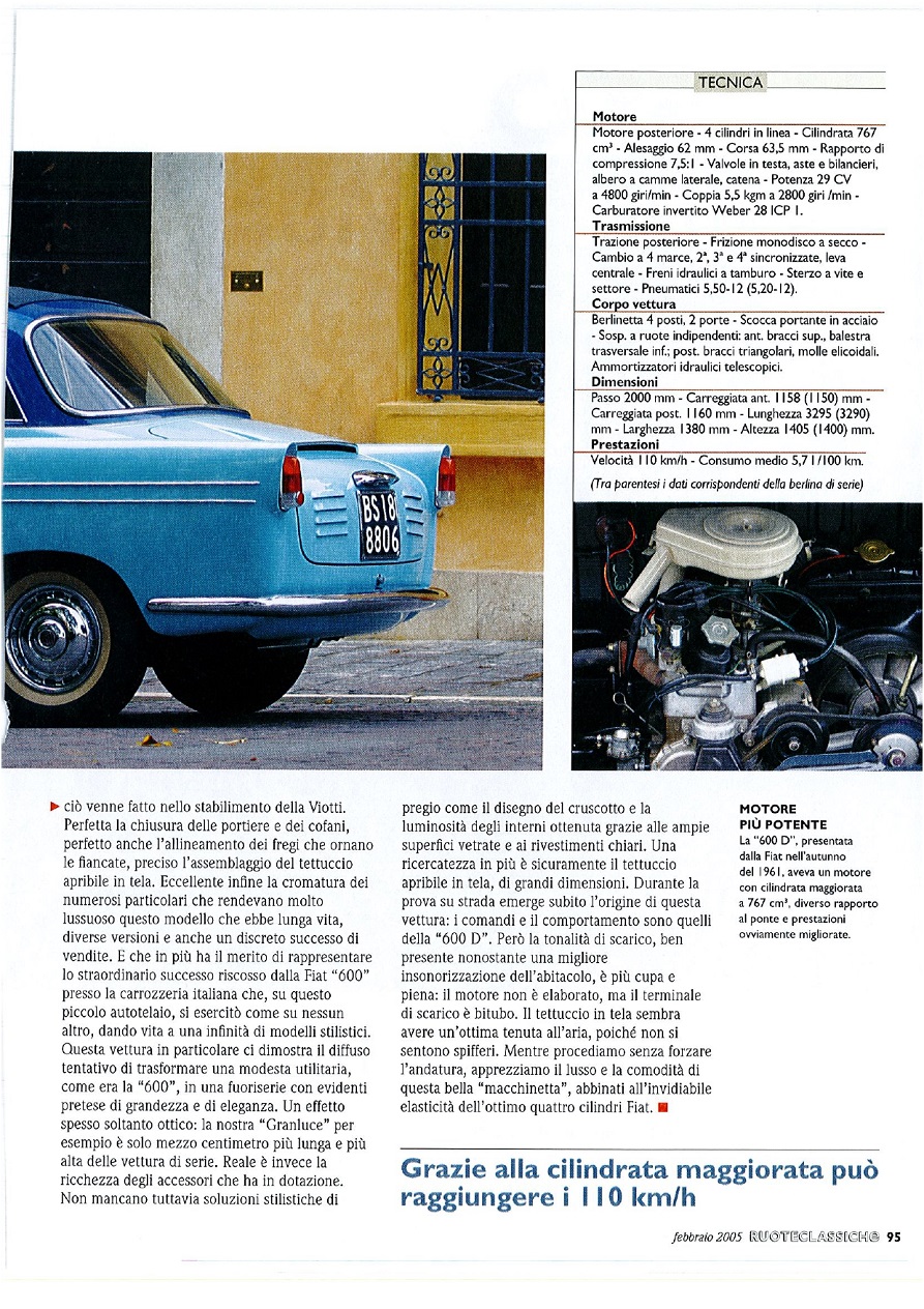La versione D del 1960 introdusse miglioramenti significativi, tra cui un motore potenziato da 767 cm³ per aumentare il divario prestazionale dalla 500. Il modello esposto dal Museo Nicolis è una versione speciale con cilindrata 750: un esclusivo coupé con tetto in tela, firmato dal celebre carrozziere Vittorino Viotti. uno dei più raffinati artigiani del design automobilistico italiano. Attivo fin dal 1921, il nome Viotti è legato, oltre che alla produzione di tante fuoriserie soprattutto su telai Fiat e Lancia, alla diffusione nel dopoguerra di un nuovo tipo di carrozzeria: la station wagon, a quei tempi chiamata più semplicemente “giardinetta”. La Fiat 600 rappresenta perfettamente l’estro creativo e il design italiano dell’epoca che contribuirono a diffondere il made in Italy nel mondo.