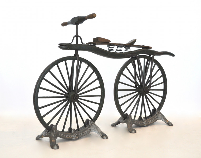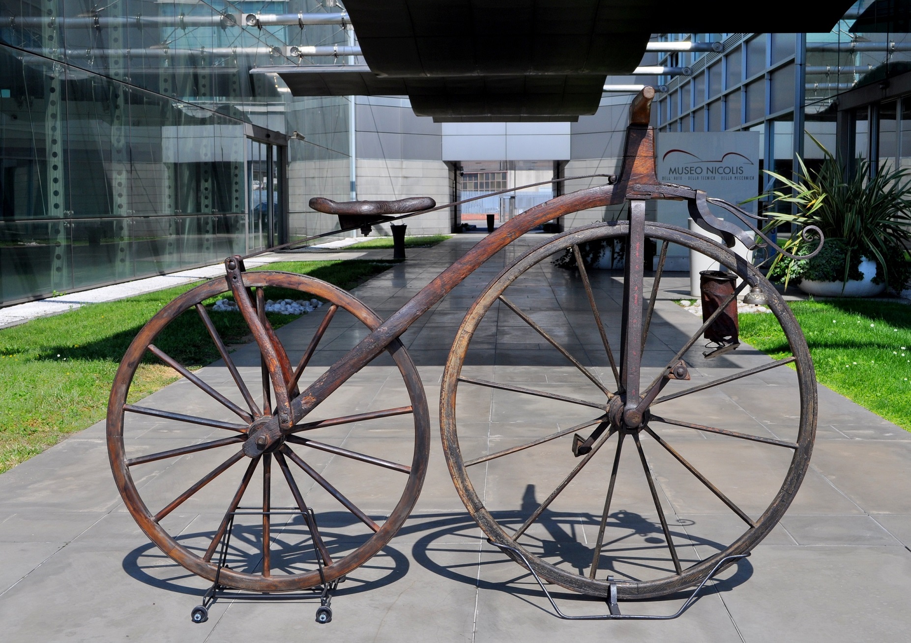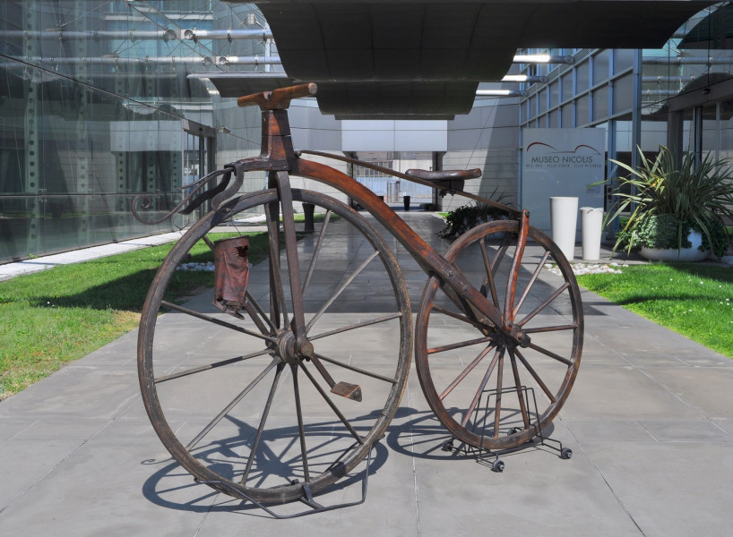 A soli 15 chilometri da Verona, sono infatti custoditi preziosi antesignani delle moderne biciclette, come la Draisina del 1817, che è l’oggetto più vicino alla nostra bicicletta: un veicolo in legno, a due ruote con lo sterzo ma senza pedali, costruito nel 1816, per il trasporto personale dall’aristocratico tedesco Karl Christian Ludwig Drais von Sauerbrohn. Per avanzare si stava a cavalcioni e si procedeva a forza di pedate sul terreno senza contare che, per cambiare direzione, era necessario fermarsi e spostare il veicolo a braccia! Ovviamente, i ciclisti dell’epoca avevano le loro difficoltà: a cavallo della draisina era facile sporcarsi calzoni e calzature. Inoltre, dovendo frenare con i piedi, coloro che si cimentavano in questa singolare corsa si ritrovavano rapidamente con le suole consumate. Drais sosteneva che, sostituendo al cavallo questa “macchina da corsa” si sarebbero risparmiati i costi della biada, spesso molto elevati. La bizzarria di questa invenzione non impedì alla Draisina di diventare una specie di giocattolo alla moda per i giovani aristocratici del tempo che, non a caso, la ribattezzarono “hobby horse”, cavallo da divertimento.