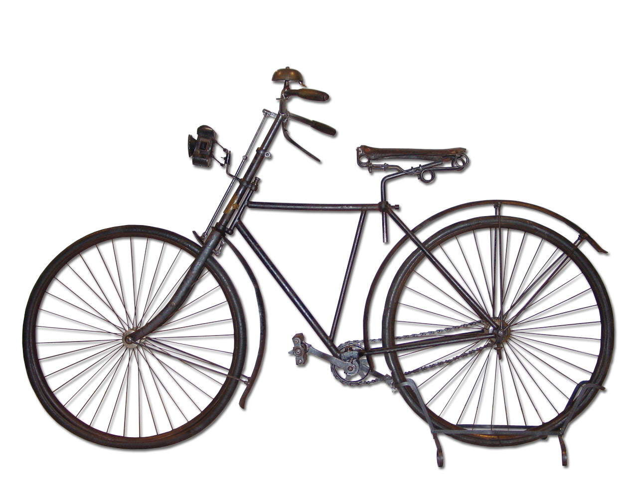 Telaio in ferro con piccolo parafango anteriore e posteriore sempre in ferro, gomme piene, campanello in ferro, fanale ad olio con stoppino, scatto fisso, catena a punto larga, staffa sulla ruota posteriore per agevolare la salita in sella, freno a tampone su ruota anteriore.