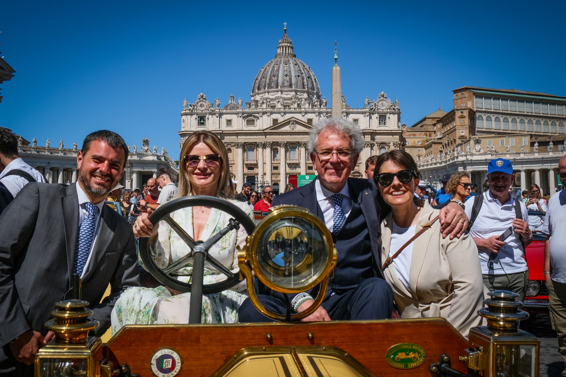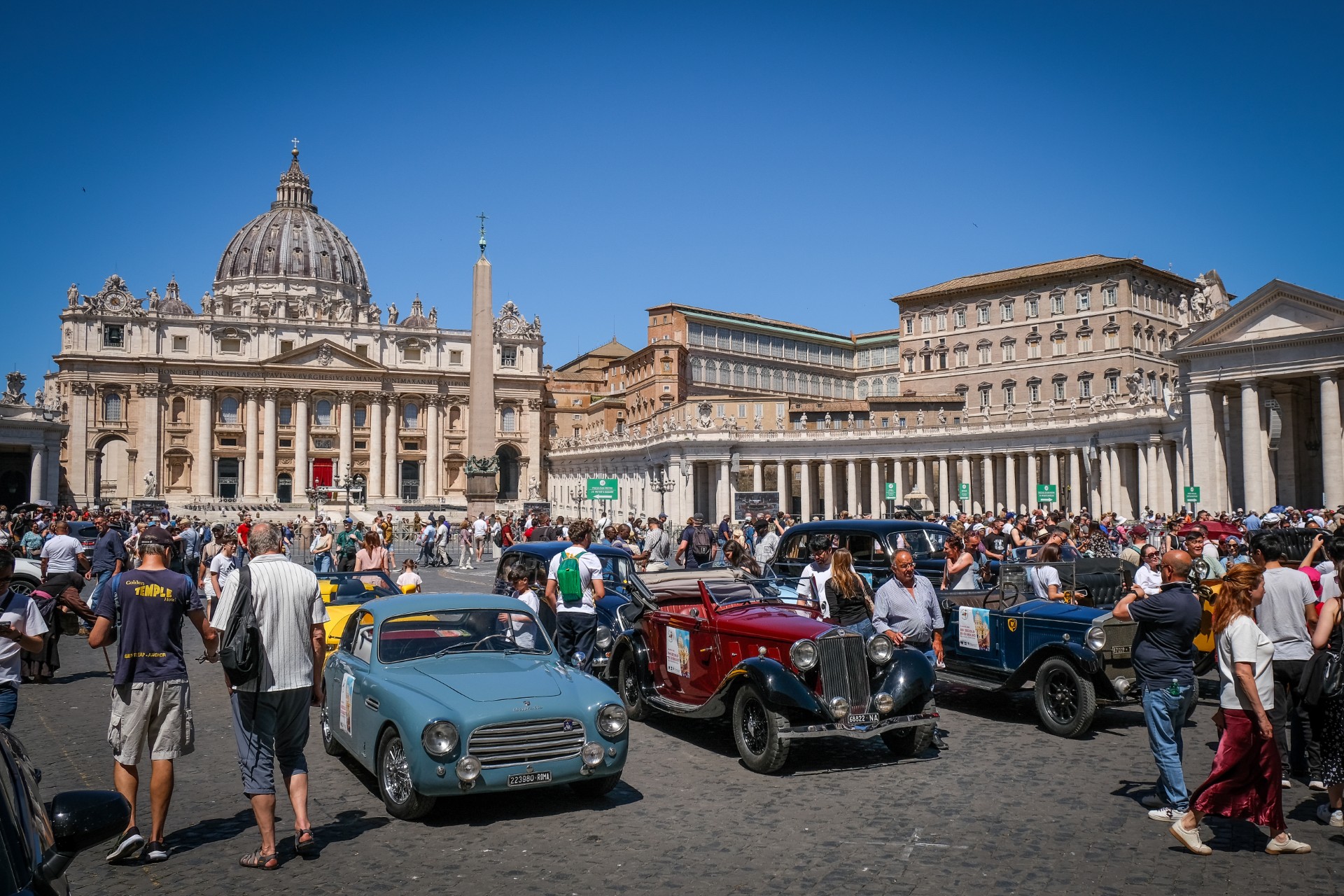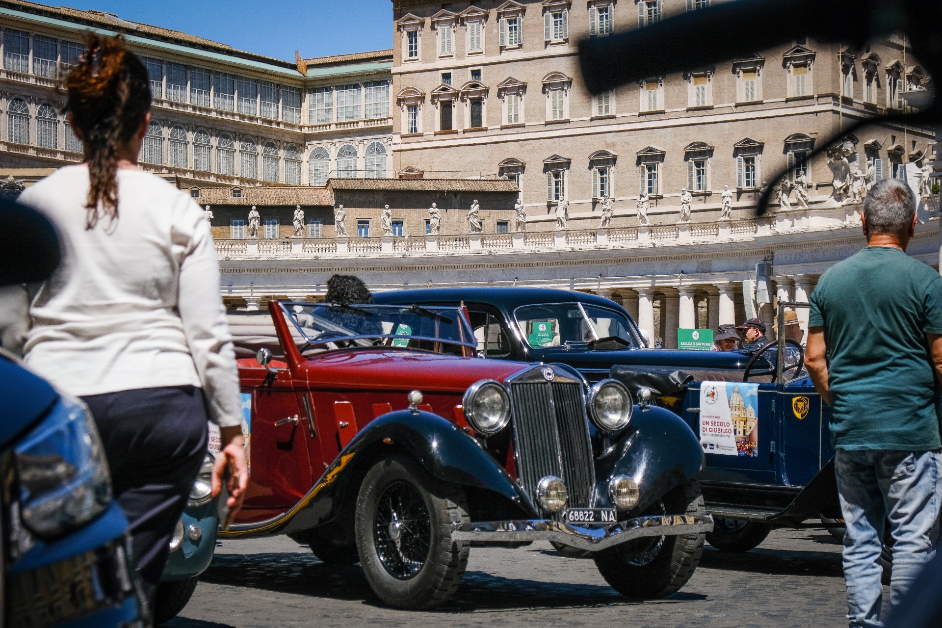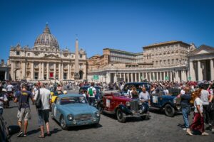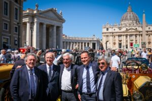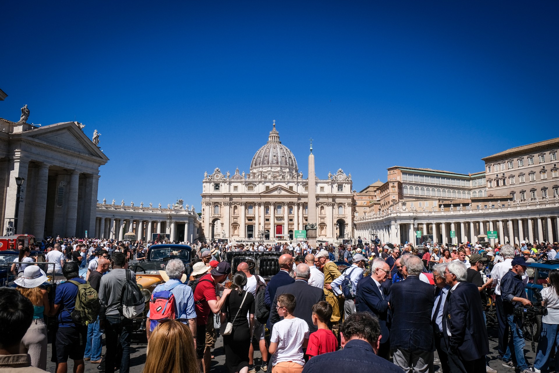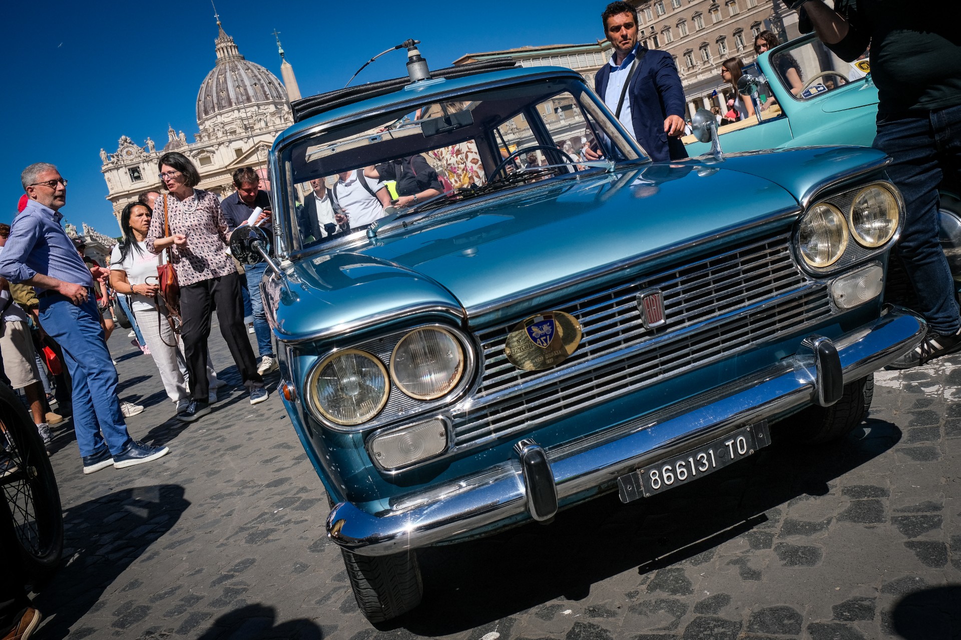 Le vetture hanno sfilato in un affascinante corteo partito dal Gianicolo fino a raggiungere Piazza San Pietro, attraversando Via della Conciliazione, dove è stata allestita un’esposizione straordinaria, aperta al pubblico. A guidare la parata, la storica Fiat 1500 del 1966 della RAI, già utilizzata nelle radiocronache del Giro d’Italia ciclistico.