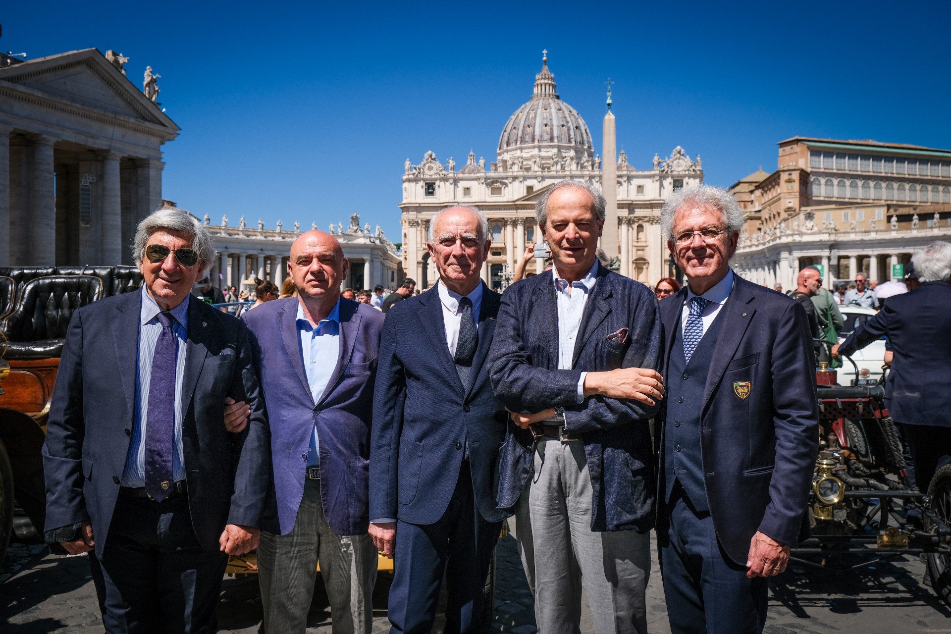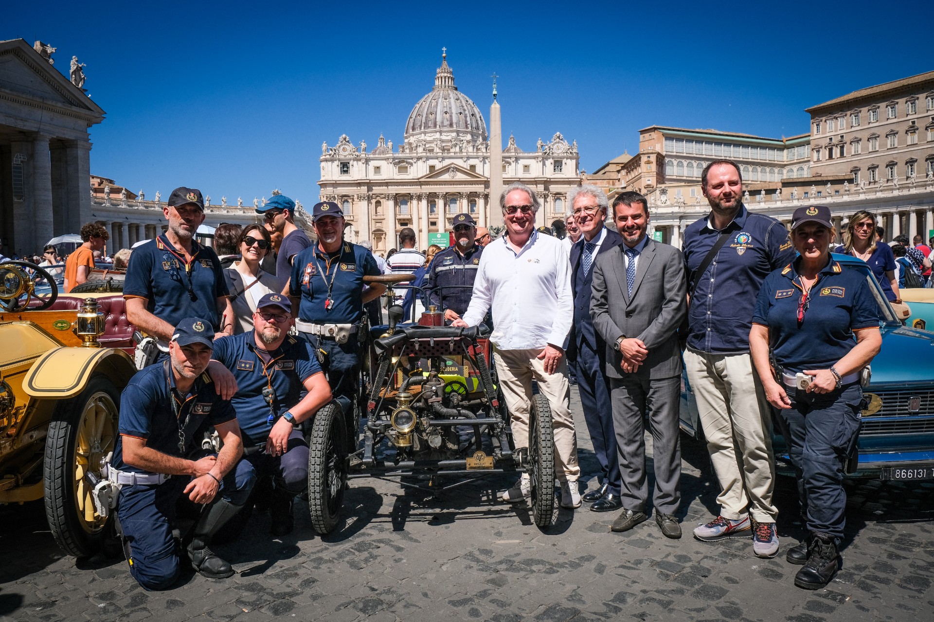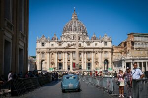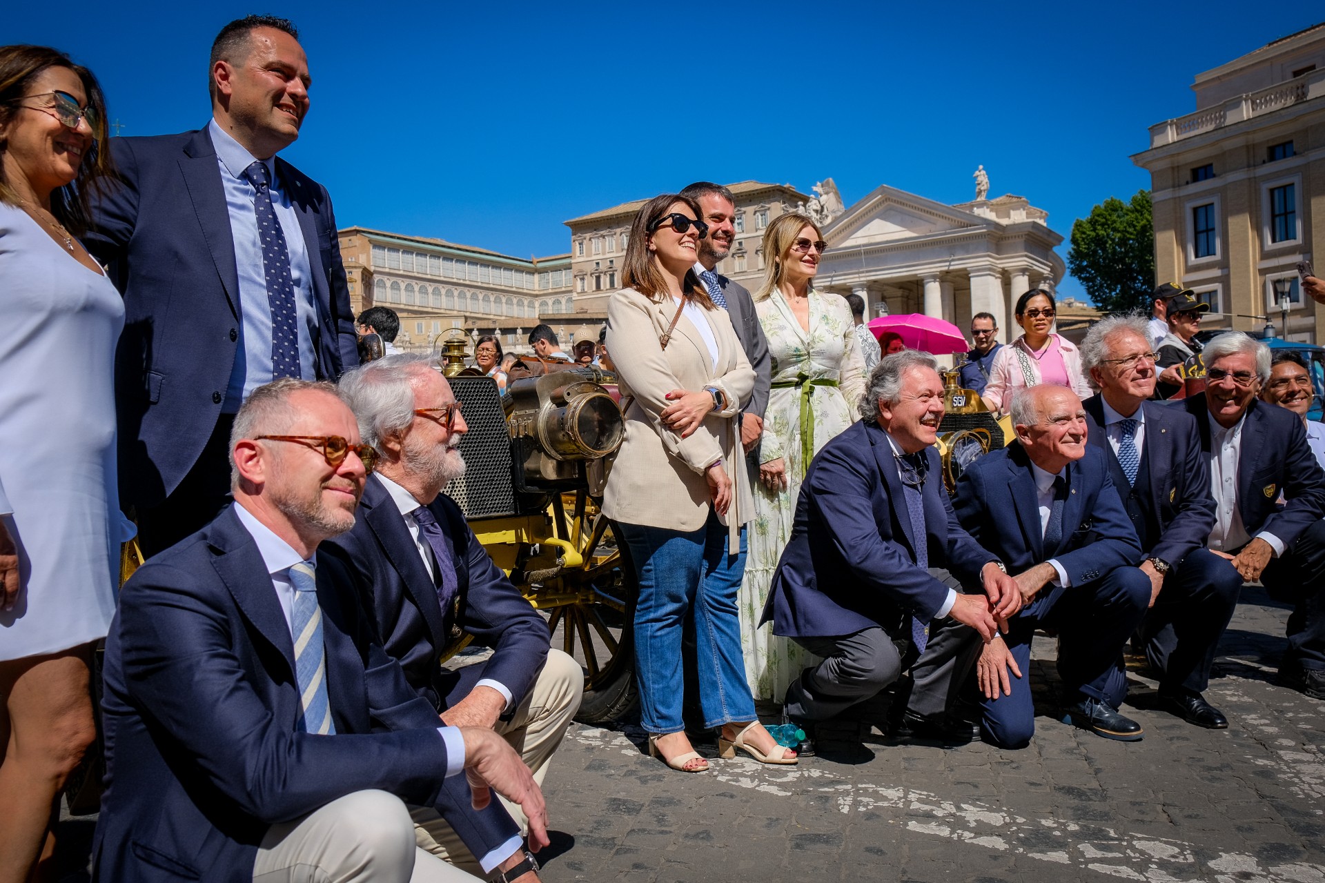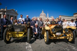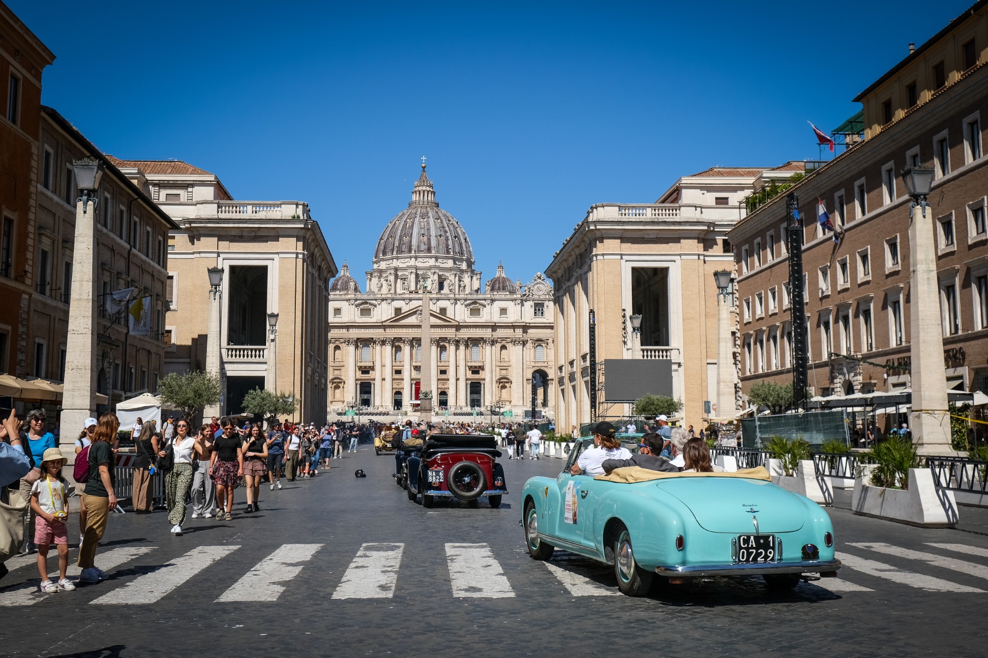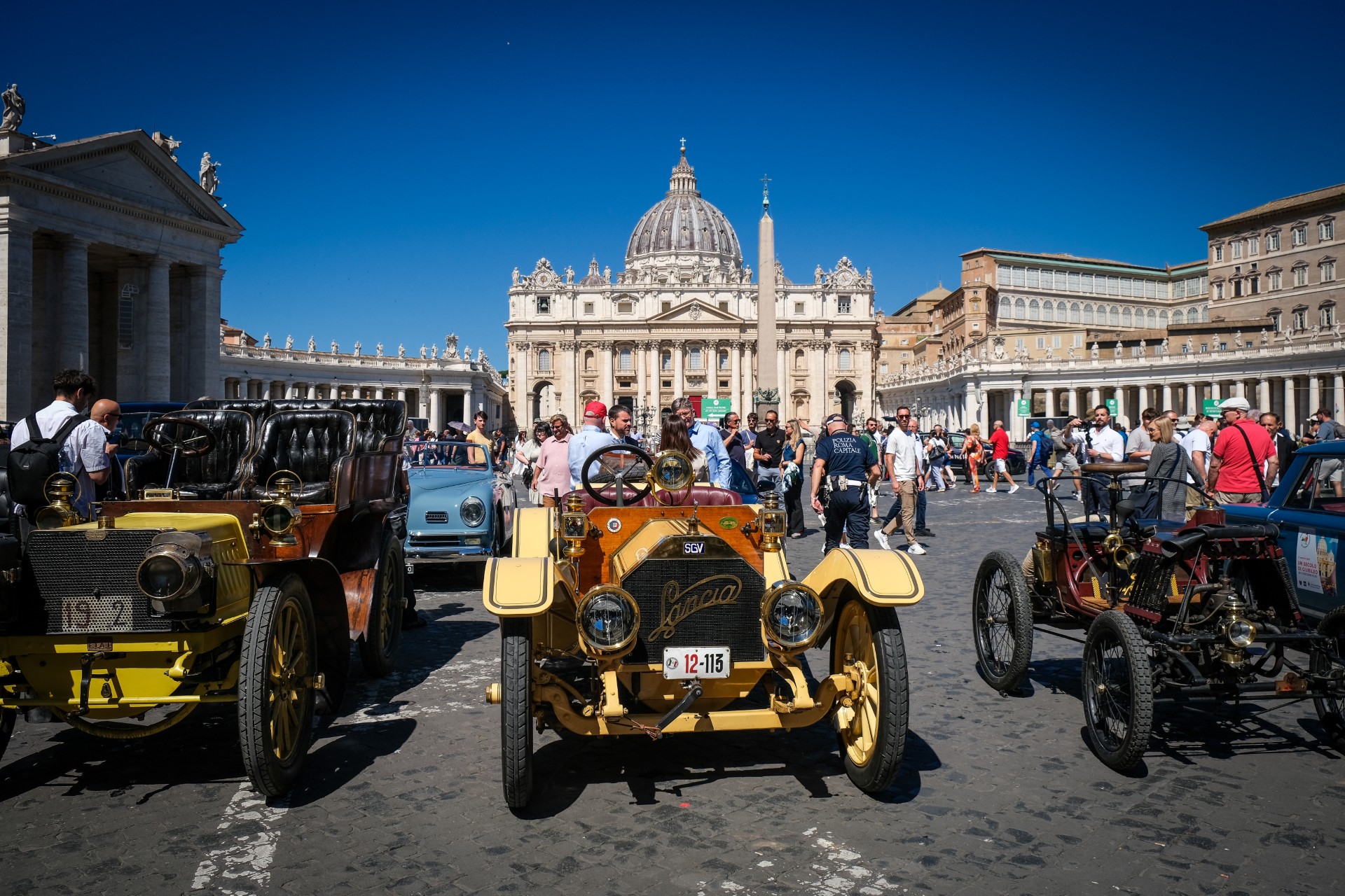 Le vetture hanno sfilato in un affascinante corteo partito dal Gianicolo fino a raggiungere Piazza San Pietro, attraversando Via della Conciliazione, dove è stata allestita un’esposizione straordinaria, aperta al pubblico. A guidare la parata, la storica Fiat 1500 del 1966 della RAI, già utilizzata nelle radiocronache del Giro d’Italia ciclistico.
