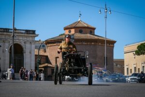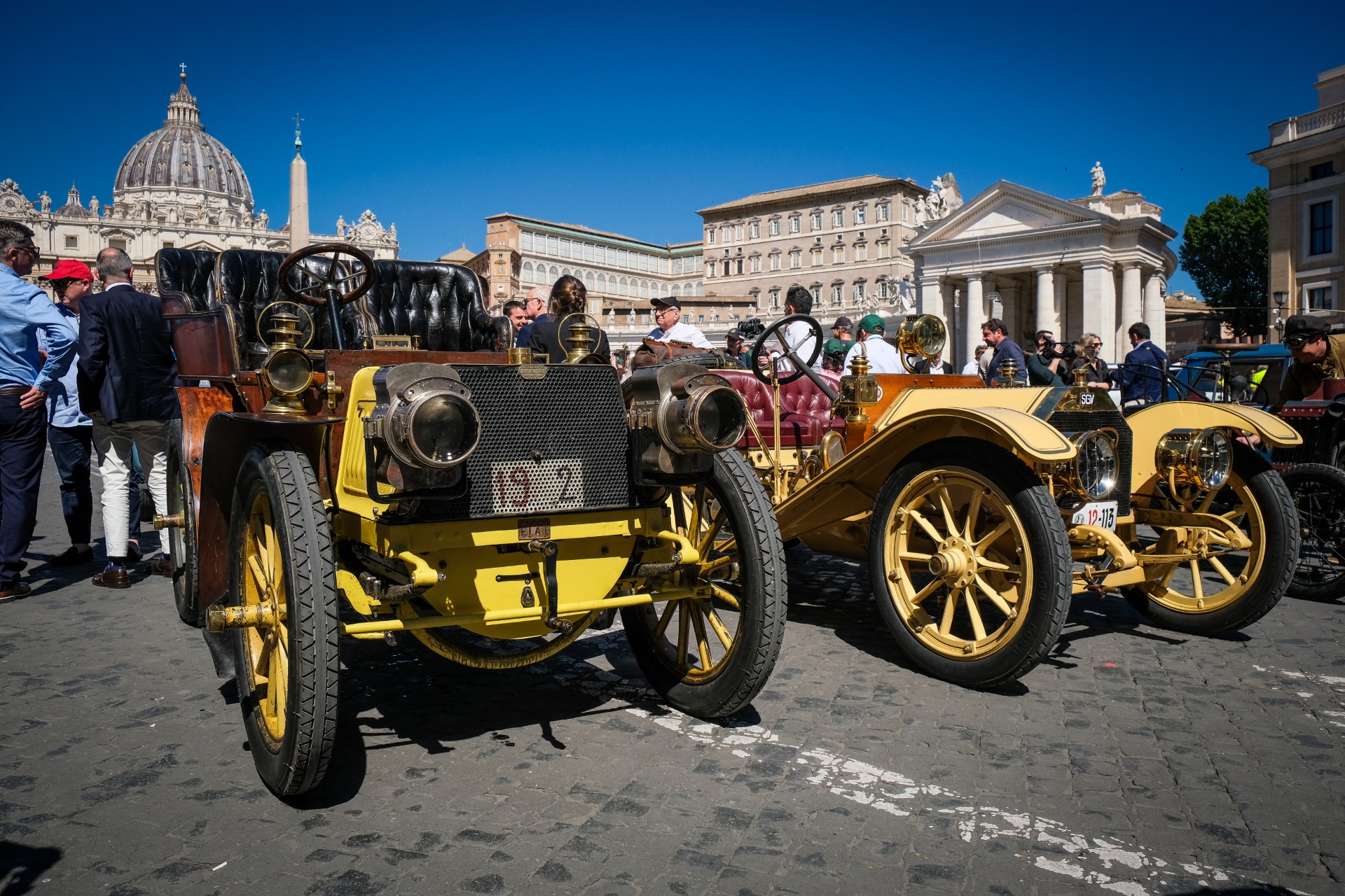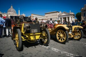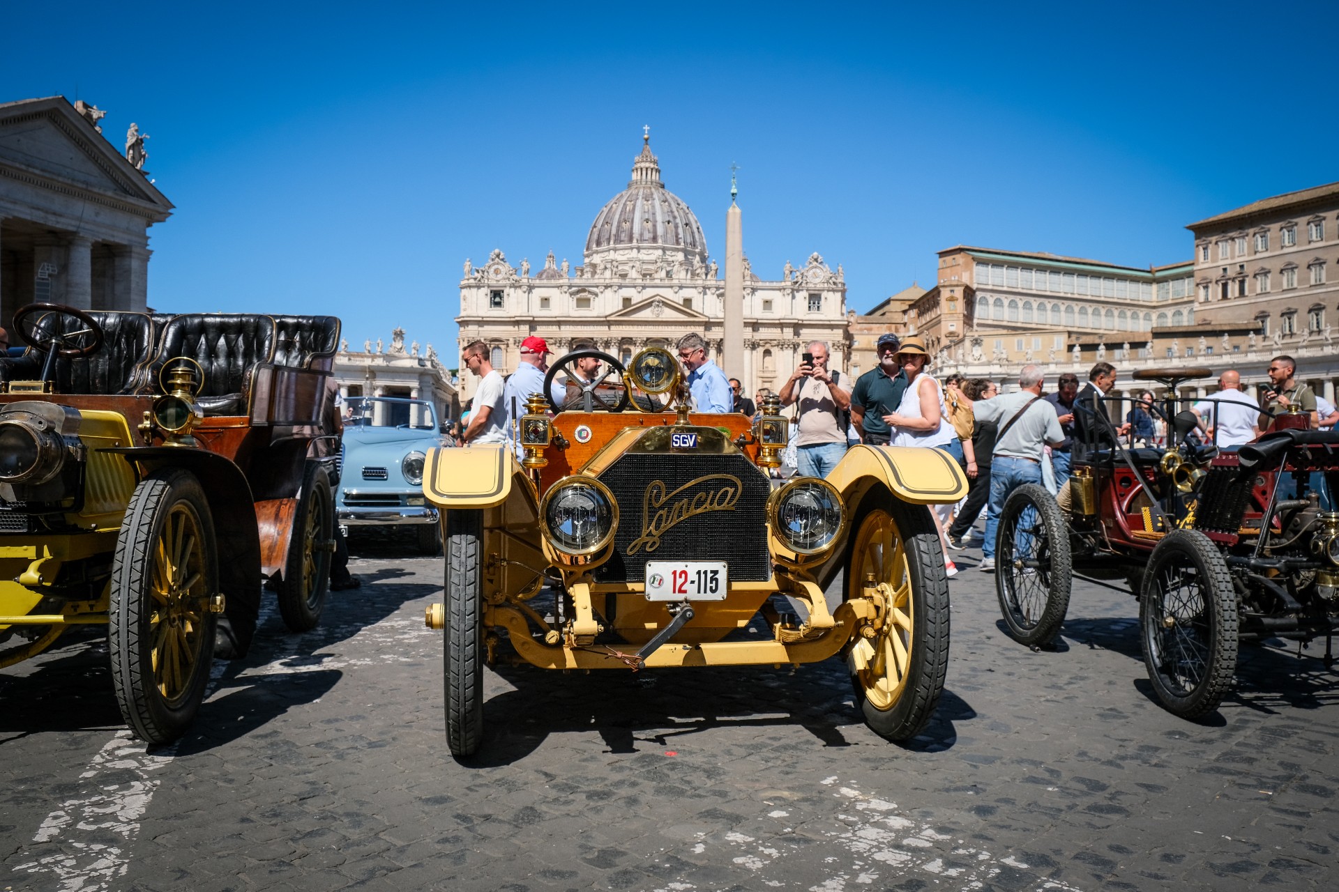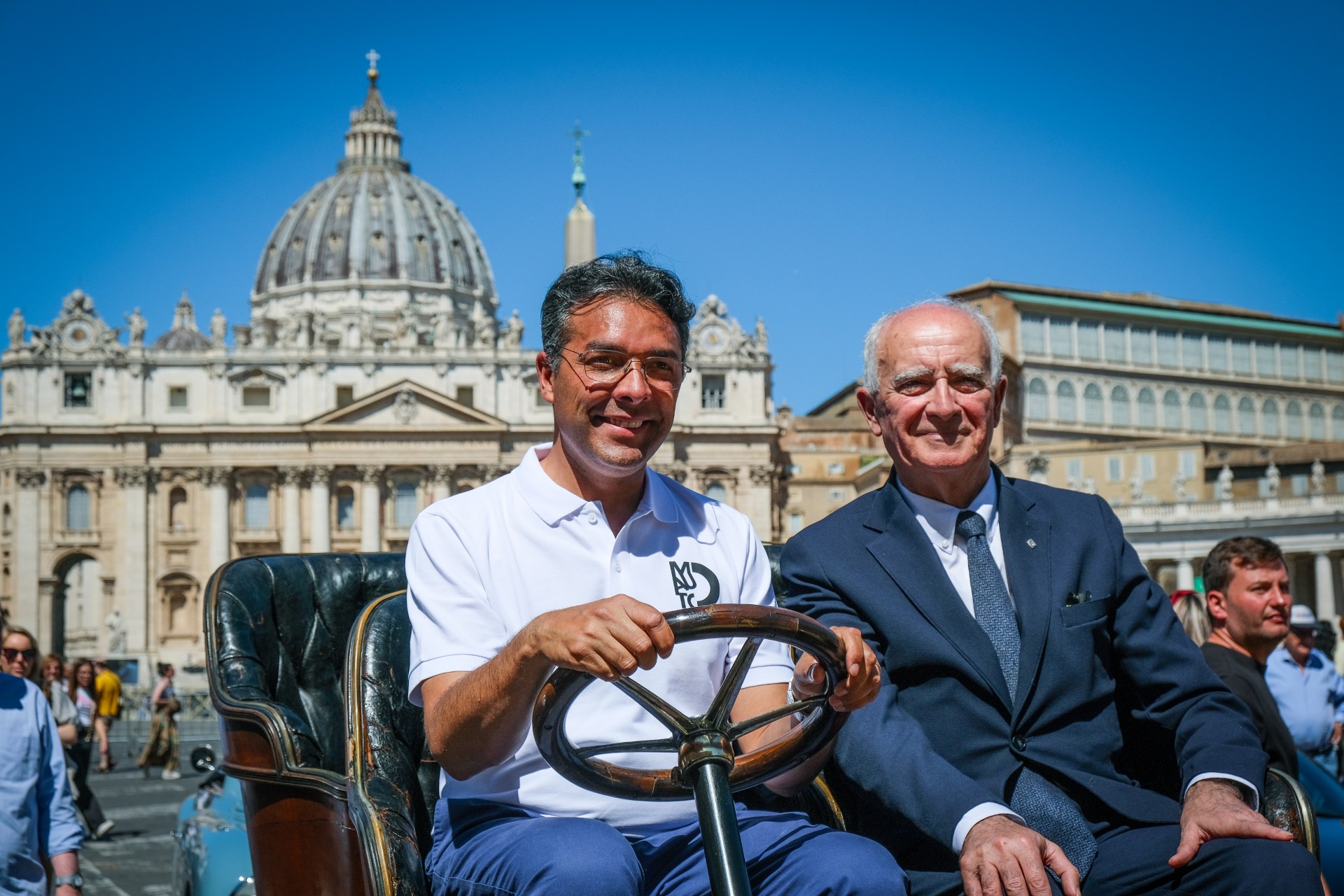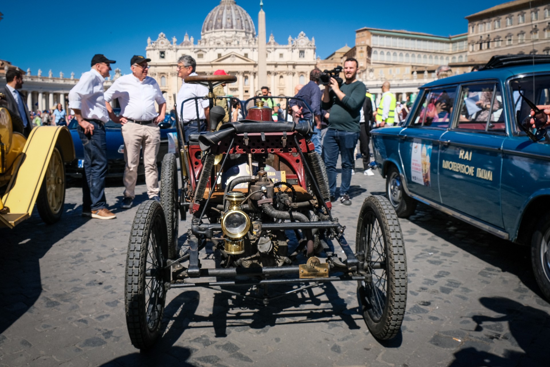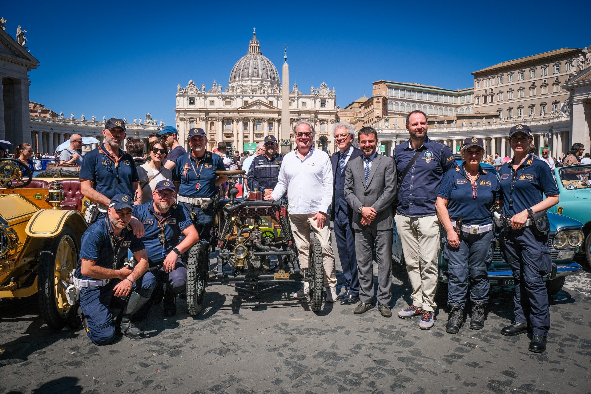 Le vetture hanno sfilato in un affascinante corteo partito dal Gianicolo fino a raggiungere Piazza San Pietro, attraversando Via della Conciliazione, dove è stata allestita un’esposizione straordinaria, aperta al pubblico. A guidare la parata, la storica Fiat 1500 del 1966 della RAI, già utilizzata nelle radiocronache del Giro d’Italia ciclistico.