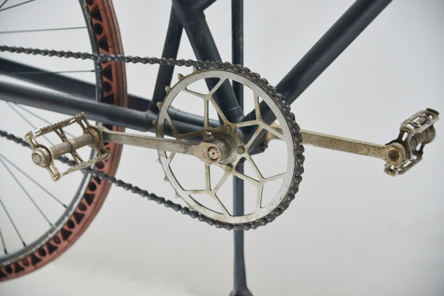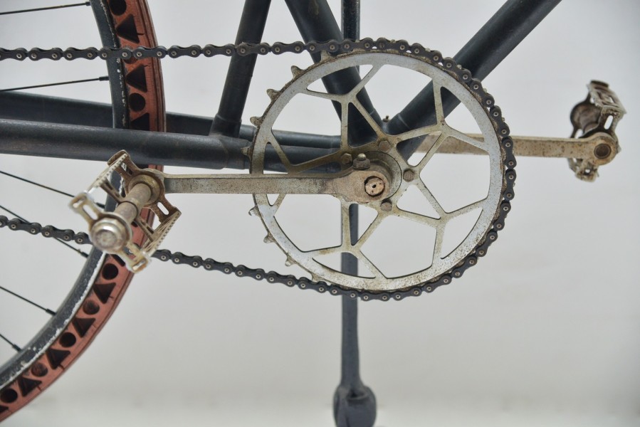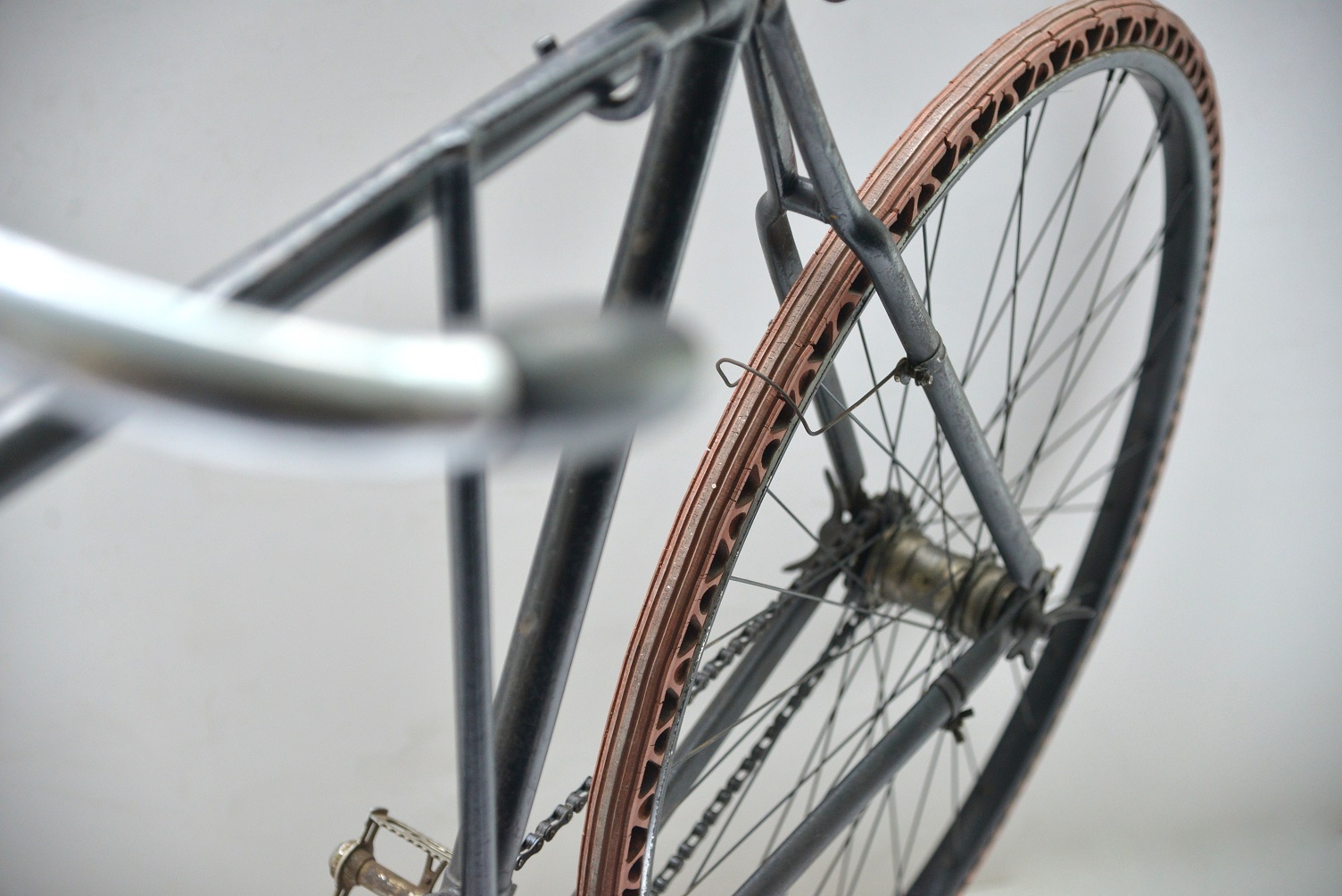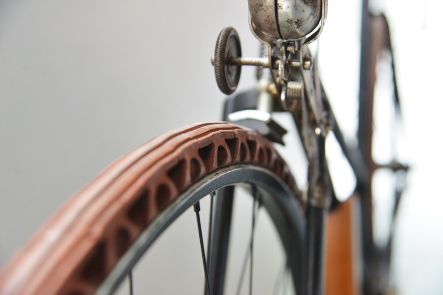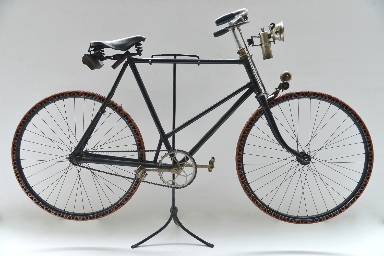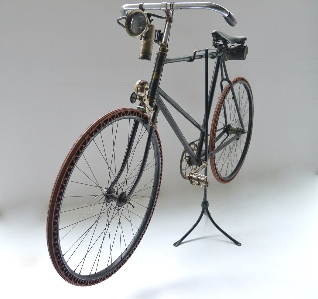 Questo gioiello fa parte di una rarissima collezione di 120 modelli d’epoca che inizia con i precursori della bicicletta dell’800, semplici modelli in legno muniti di ruote, di sterzo e senza pedali. Da qui i successivi velocipedi con grande ruota anteriore a scatto fisso che in poco tempo si sono evoluti in una miriade di variabili con applicazioni di ogni tipo: ruote di legno, gomma piena, camera d’aria ecc. ed è proprio in questo contesto che si inserisce l’ingegnosa – gomma che non si buca mai -.