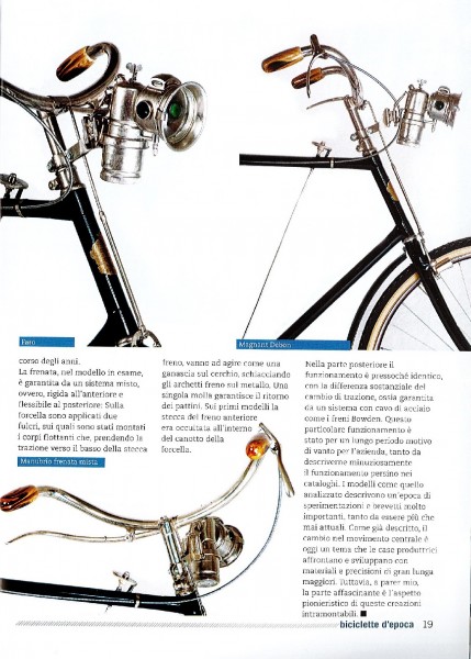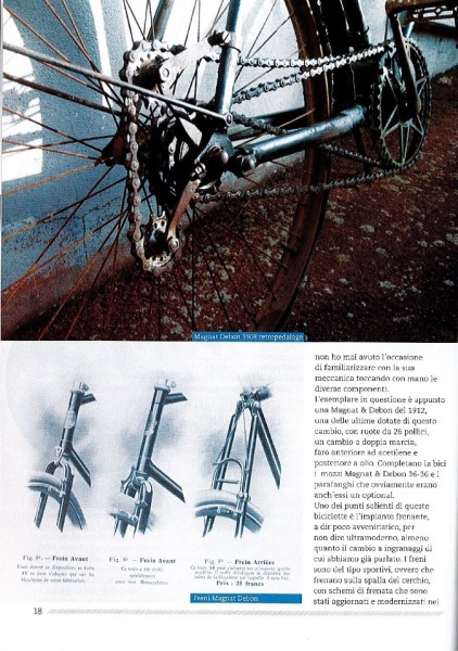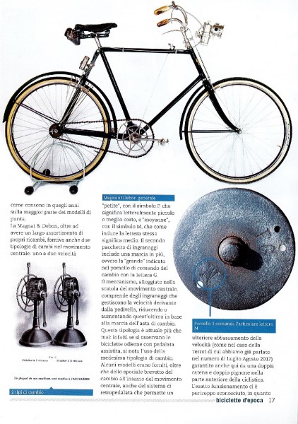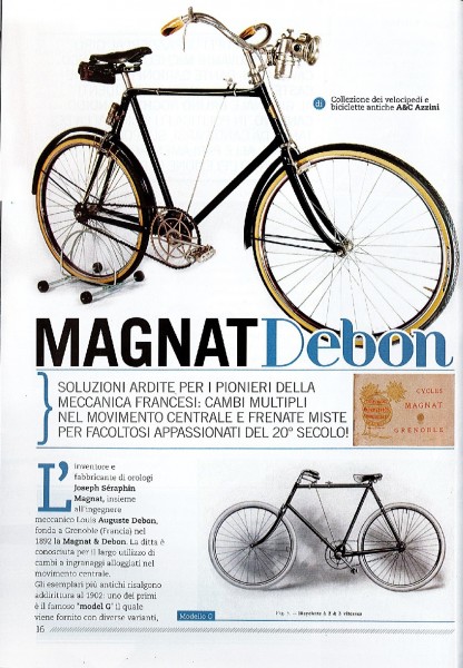Bicicletta da uomo di colore nero con filetti oro, particolare il cambio di velocità a 2 o 3 rapporti sul movimento centrale, comando da girante posto sul tubo orizzontale. Questo tipo di cambio era un brevetto esclusivo della Magnat & Debon a cui deve il suo successo nel mondo del ciclismo. L'inventore e fabbricante di orologi Joseph Séraphin Magnat, insieme all'ingegnere meccanico Louis Auguste Debon, fonda a Grenoble (Francia) nel 1892 la Magnat-Debon. La ditta è conosciuta per il largo utilizzo di cambi a ingranaggi alloggiati nel movimento centrale. Gli esemplari più antichi risalgono addirittura al 1902. Fonte: "Biciclette d'epoca", dicembre 2017.
