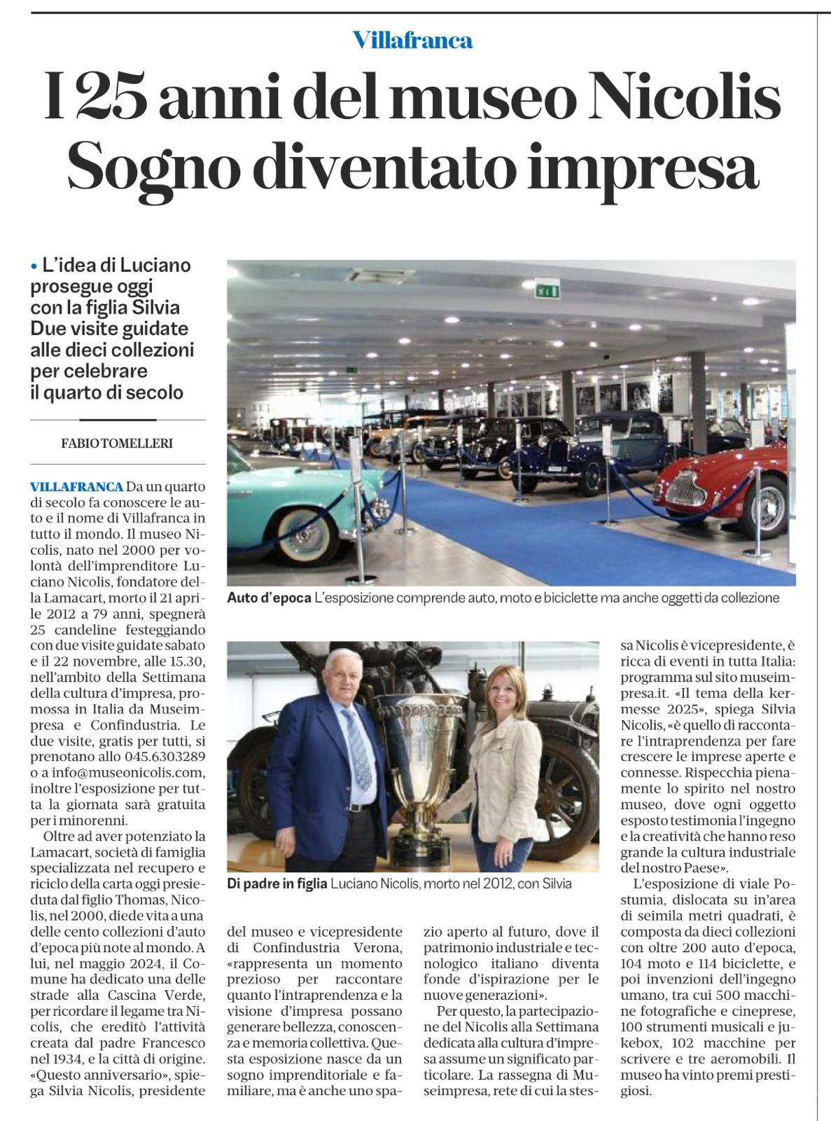 Museo Nicolis, Villafranca di Verona, auto d’epoca, L’Arena, articolo