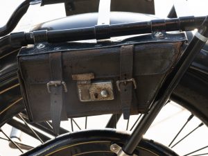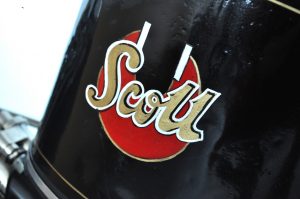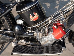 Realizzata prima della “Grande Guerra” questa Scott è una 486cc che si fa notare per alcune particolarità che esaltano la sua unicità: l’accensione avviene tramite pedalina spingendo in avanti invece che indietro, il serbatoio dell’olio è collocato nel telaio, il freno si trova all’interno della corona posteriore e, infine, la lubrificazione è a goccia su entrambi i cilindri.