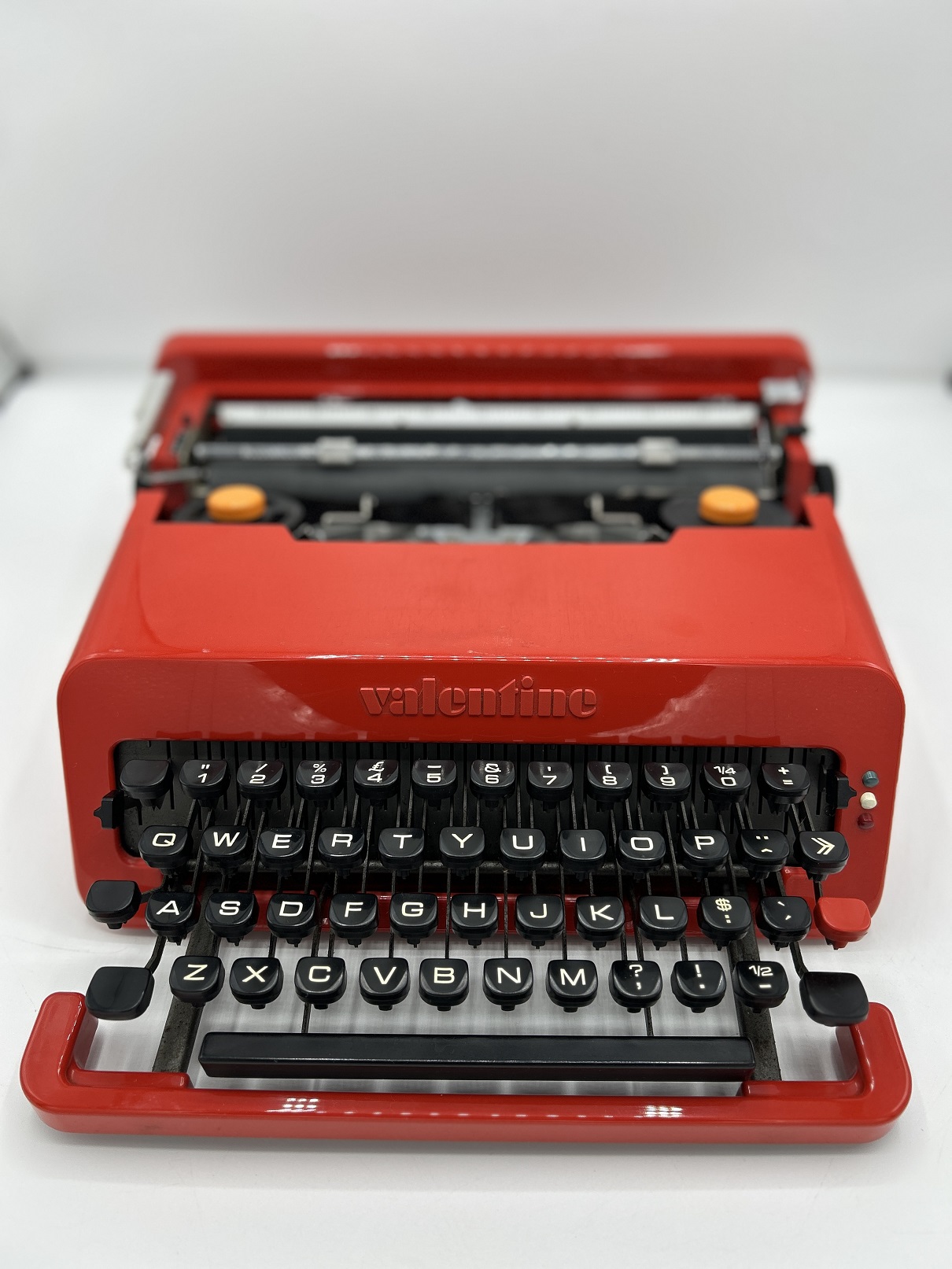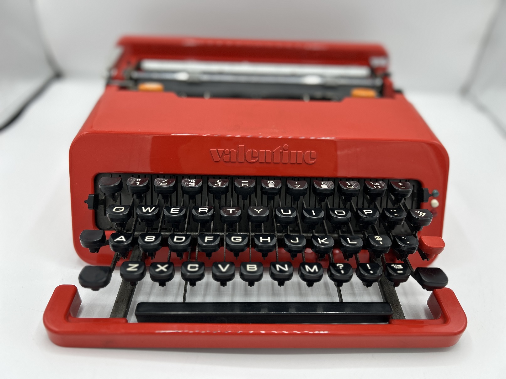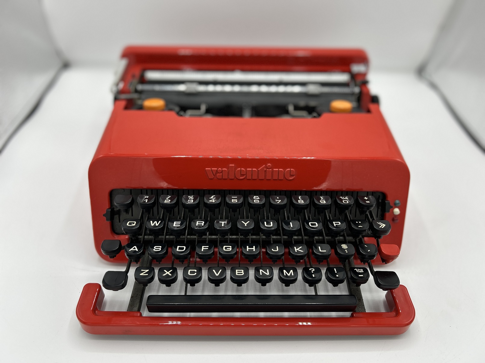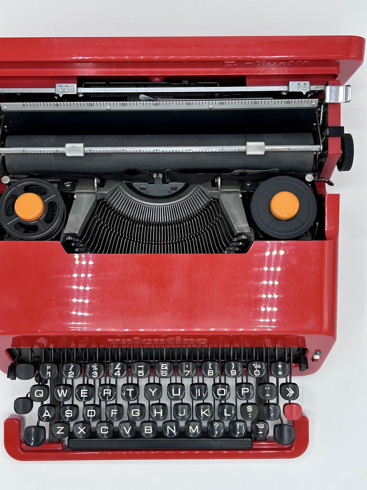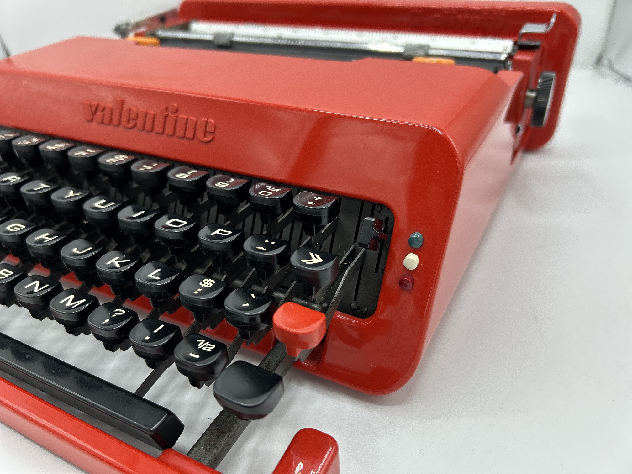 Curiosità: Ettore Sottsass si unì al team di progettazione Olivetti nel 1958, che all'epoca comprendeva Marcello Nizzoli, designer della celebre Lettera 22. Sottsass si ispirava alla pop art dell'epoca e questo è evidente nel design della Valentine: l'involucro in plastica ABS rosso brillante lo distingueva dagli altri apparecchi da ufficio dell'epoca, realizzati nel consueto alluminio, così come il copribobina del nastro a due coperture di colore giallo-arancio. La tastiera si stacca dal resto della macchina in maniera netta grazie all’accostamento dei colori rosso e nero, in modo da fare dello strumento di scrittura un ‘oggetto’ atto a farsi notare e ad essere utilizzato anche da un pubblico meno professionalmente motivato alla scrittura meccanica. Anche la custodia rigida è costruita per rendere semplice il trasporto, quasi a ricordare una shopping bag; può addirittura essere utilizzata come sgabello, per sedersi e scrivere con la macchina appoggiata sulle ginocchia.