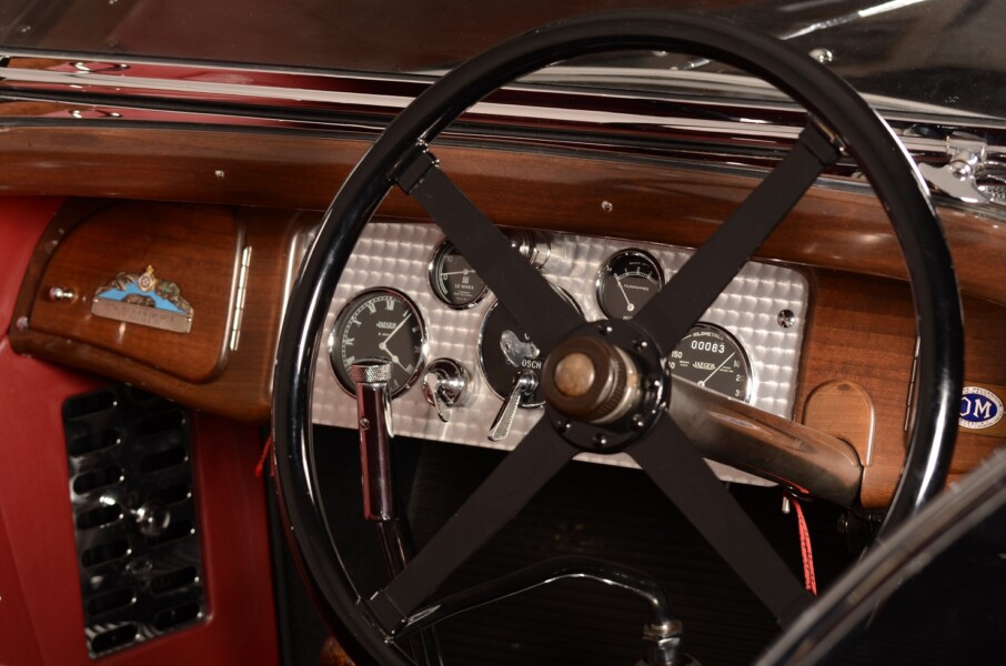 La 665 Superba, presentata nel 1923 e prodotta in varie serie e modelli fino al 1932, fu la vettura più conosciuta e apprezzata della produzione OM, grazie ai suoi successi sportivi, culminati con la conquista dei primi tre posti alla prima edizione della Mille Miglia nel 1927. Dopo la vittoria dell’Alfa Romeo alla Mille Miglia del 1928, la OM comprese l’importanza del compressore e nel 1929 mise a listino un modello sportivo provvisto di compressore Roots. Da quel momento in avanti fu possibile acquistare una OM con o senza compressore, a valvole in testa o laterali. La vettura del Museo è della serie 665 SSMM; dotata di compressore Roots, è una delle vetture che l’importatore inglese della OM fece modificare, dotandole di testa cilindri con valvole in testa anziché laterali. Le teste inglesi erano in ghisa e il lato combustione era lavorato piatto. I pistoni erano a testa tonda, poiché la posizione bassa delle candele impediva l’uso di pistoni concavi. Il blocco era naturalmente speciale, in ghisa, per dodici candele da 18 mm, sei per lato fissate in fori ben mascherati. Nelle versioni stradali per l’accensione erano previsti magnete, spinterogeno e bobina 6 cilindri. Le versioni competizione probabilmente adottavano due magneti per la doppia accensione. Grazie alla leggera e ben profilata carrozzeria spider costruita dalla Carrozzeria Castagna questa vettura era in grado di raggiungere i 150 km/h.