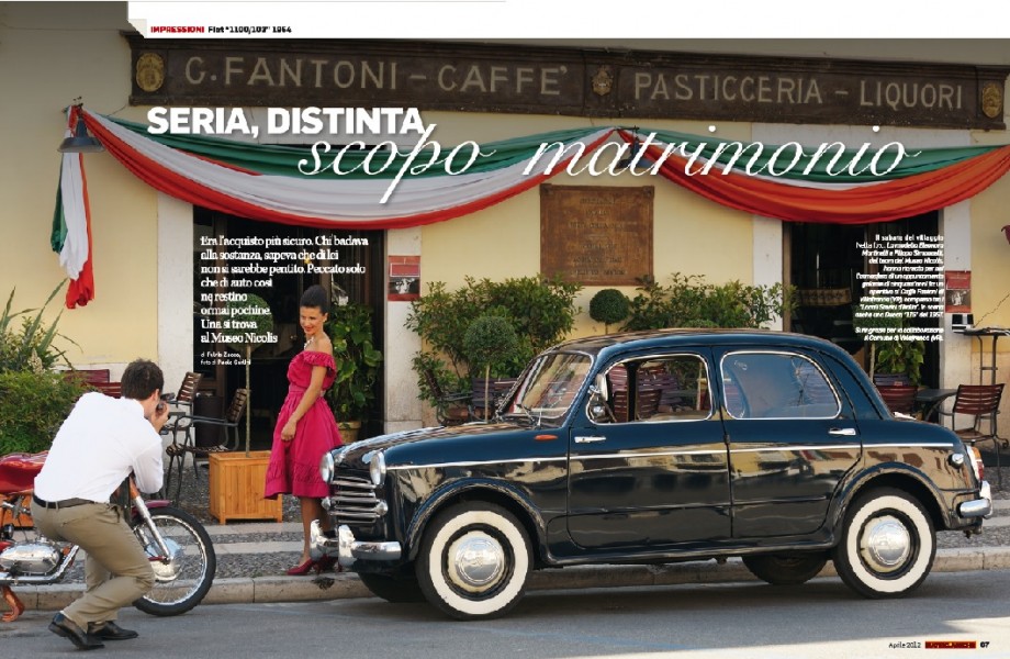 La storica Fiat 1100 del Museo Nicolis nello shooting di Ruoteclassiche ambientato nel centro di Villafranca, il suo storici Caffè Fantoni ed il Castello.
