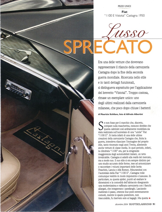 Era una delle vetture che dovevano rappresentare il rilancio della carrozzeria Castagna dopo la fine della seconda guerra mondiale. Ricercata nello stile e in tanti dettagli funzionali, si distingueva soprattutto per l’applicazione del brevetto “Vistotal”. Troppo costosa, rimase un esemplare unico: uno degli ultimi realizzati dalla carrozzeria milanese, che poco dopo chiuse i battenti.  Se non fosse per il marchio che, discreto, compare sulla mascherina, nessuno direbbe che questa cabriolet così arditamente modellata sia stata realizzata sull’autotelaio di una “umile” Fiat “1100 E”. Si tratta infatti di una delle ultime creazioni della carrozzeria Castagna che, finita la guerra, intendeva rilanciare l’immagine del proprio stile, tanto rinomato negli anni Trenta, allestendo anche vetture di classe media. In quel periodo, infatti, la cilindrata “1100” era, per la stragrande maggioranza degli automobilisti italiani, un tetto invalicabile. Castagna si adattò alla realtà del mercato, ma a modo suo. Il suo stile si era sempre distinto per uno studio accurato delle forme, tese ad armonizzare e raccordare i volumi importanti delle Isotta Fraschini, Lancia e Alfa Romeo. Misurandosi con l’autotelaio della Fiat “1100 E”, Castagna volle comunque vestirlo in modo imponente e lussuoso. In particolare, su questa spider, puntò ad esaltare le dimensioni e la comodità dell’abitacolo disegnando una modernissima e raffinata carrozzeria con i fianchi allargati, che integravano i parafanghi. Lasciando inalterato il passo, ottenne due posti estremamente comodi, mentre lo spazio posteriore, non trascurabile, fu riservato solo ai bagagli. Ma questa vettura, oltre che per la linea e per alcuni dettagli estetici decisamente originali, si distingueva soprattutto per il parabrezza e i vetri laterali privi di cornici è di montanti, realizzati secondo il sistema brevettato “Vistotal”, di cui parliamo nel box a pagina 92. Costruita con cura maniacale e ricca di pregevoli soluzioni tecniche e stilistiche, questa spider risultò troppo costosa per i suoi tempi e non trovò mai un cliente. Il destino della carrozzeria milanese, incapace di adattarsi a un mercato ancora povero, si compì pochi anni dopo. L’attività cessò nel 1954 e alcune vetture rimasero in famiglia a testimonianza di un glorioso passato. Tra queste, la “1100 E Vistotal”, che fu immatricolata a Trieste e passò la maggior parte della propria vita chiusa nei garage di famiglia. Da qualche anno fa parte della collezione di Luciano Nicolis, che l’ha esposta nel suo museo. “L’ho ritirata praticamente nelle condizioni in cui la vedete ora, racconta Nicolis. “La carrozzeria, che è in alluminio, è stata solo ritoccata in alcuni punti per nascondere delle piccole crepe formatesi sulla verniciatura e poi lucidata. La capote, con un telaio in legno e acciaio, che è di per sé un capolavoro d’artigianato, è ancora del tutto originale; la pelle che riveste i sedili è stata solo pulita, mentre è stata rifatta la moquette che ricopre la parte anteriore del pavimento; quella posteriore invece è originale. Come vedete, non c’è quasi diferenza, perché ho esaminato moltissime moquette prima di individuare quella più simile. Il tocco finale sono i riquadri neri con la scritta chiara ‘Castagna’, che ho fatto realizzare appositamente. L’autoradio non funzionava più ma, con un po’ di pazienza, è stata riparata. La maniglia della porta lato guida, in cattive condizioni, è stata ricostruita lavorando a mano un pezzo d’alluminio. L’originale era fusa in zama“. Oltre al parabrezza “Vistotal”, perfettamente piano e di spessore notevole, Nicolis ci fa notare un altro particolare tecnicamente molto interessante, che riguarda il funzionamento della capote. La centina inferiore, che si appoggia alla carrozzeria, ha i tratti laterali che possono allargarsi e restringersi, grazie al fatto che i perni ai quali sono incernierati sono a vite. Quando la capote viene aperta la centina si restringe per poter entrare nell’apposito vano ricavato nella carrozzeria. Quando la capote viene chiusa la centina si allarga, per poter appoggiare correttamente sulla carrozzeria. Notevoli poi le dimensioni del lunotto e la luce di cortesia all’interno della capote: una vera rarità per una spider. Le frecce a bacchetta, illuminate, funzionano ancora perfettamente ma, presumibilmente dal ’59, per ottemperare al rinnovato Codice della Strada, questa vettura monta fanalini a gemma davanti e dietro e dei ripetitori laterali sui parafanghi anteriori. “Quelli che ho trovato quando l’ho ritirata”, aggiunge Nicolis, “erano di plastica. Ne ho fatto montare altri in vetro, sicuramente più corretti per l’inizio degli anni 50”. Abbassandoci per osservare meglio i bordi raccordati dei massicci passaruota, notiamo anche i profili paracolpi in alluminio, che proteggono i paraurti in acciaio cromato. L’esame statico è terminato e siamo ansiosi di accomodarci nell’abitacolo per fare un giro su questa spider davvero esclusiva. Sedendoci al posto di guida apprezziamo la posizione a gambe distese e il notevole spazio ai lati, certo maggiore di quello a disposizione sulla “1100 E” berlina. Rispetto a quest’ultima infatti i sedili sono più larghi e distanziati e al centro c’è posto per un bracciolo che, all’occorrenza, si può ribaltare all’indietro. Inoltre i pannelli interni delle porte, generosamente imbottiti, hanno uno “scavo” centrale per dare più spazio agli avambracci. Purtroppo la maggiore abitabilità in senso trasversale si paga con un certo disassamento del volante e della pedaliera, che hanno conservato la loro posizione originaria sull’autotelaio. Ma dopotutto questa spider, che monta lo stesso motore della. berlina, non ha velleità sportive e si “domina” benissimo anche così. D’altra parte lo sguardo viene subito catturato dal prezioso volante con corona in plexiglas tra