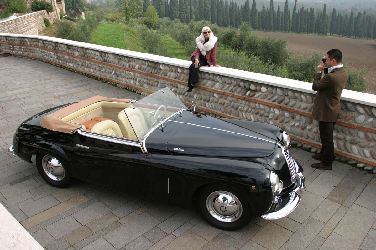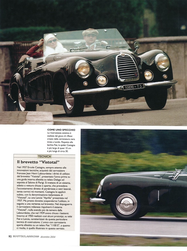 Il brevetto “Vistotal” – Nel 1937 Ercole Castagna, sempre attento alle innovazioni tecniche, acquistò dal carrozziere francese Jean Henri Labourdette i diritti di utilizzo del brevetto “Vutotal”, presentato l’anno prima su una guida interna allestita su telaio Delage ed esposta al Salone di Parigi. Si trattava di un sistema, adatto a vetture chiuse o aperte, che prevedeva l’accostamento diretto di parabrezza e vetri laterali, senza cornici né montanti. Castagna lo applicò subito, con la denominazione italianizzata di “Vistotal”, su una Lancia “Aprilia” presentata nel 1937. Ma presto dovette sospenderne l’utilizzo, in seguito a una vertenza sul brevetto. Nel dopoguerra il carrozziere milanese rispolverò il sistema “Vistotal”, nulla avendo più da temere dalla Labourdette, che nel 1939 aveva chiuso i battenti. Intorno al 1950 realizzò così alcuni prototipi, su telai Fiat e Lancia, caratterizzati da questa particolare tecnica di costruzione. L’unico con carrozzeria aperta allestito su un telaio Fiat “1100 E”, a quanto ci risulta, è quello illustrato in questo servizio.