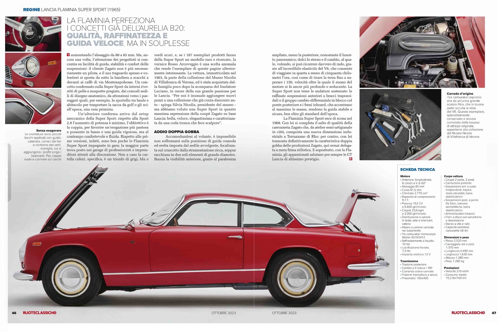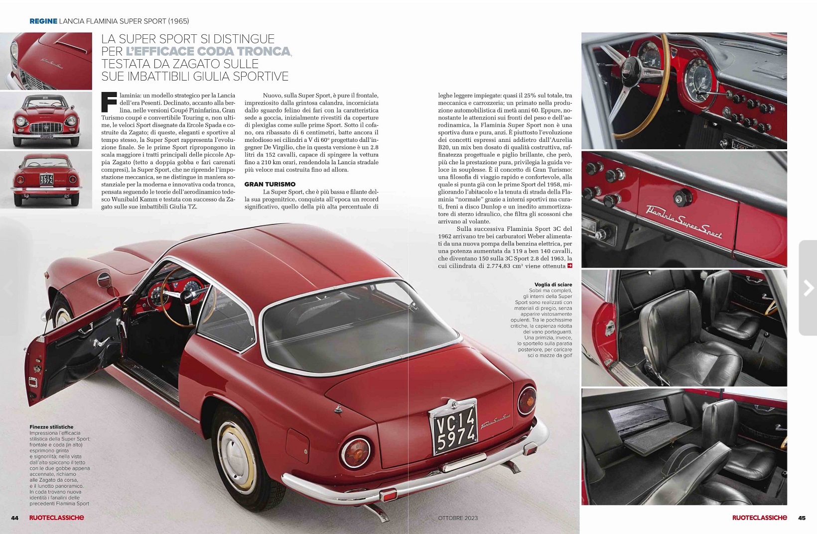 Flaminia: un modello strategico per la Lancia dell’era Pesenti. Declinato, accanto alla berlina, nelle versioni Coupé Pininfarina, Gran Turismo coupé e convertibile Touring e, non ultime, le veloci Sport disegnate da Ercole Spada e costruite da Zagato; di queste, eleganti e sportive al tempo stesso, la Super Sport rappresenta l’evoluzione finale. Se le prime Sport ripropongono in scala maggiore i tratti principali delle piccole Appia Zagato (tetto a doppia gobba e fari carenati compresi), la Super Sport, che ne riprende l’impostazione meccanica, se ne distingue in maniera sostanziale per la moderna e innovativa coda tronca, pensata seguendo le teorie dell’aerodinamico tedesco Wunibald Kamm e testata con successo da Zagato sulle sue imbattibili Giulia TZ. Nuovo, sulla Super Sport, è pure il frontale, impreziosito dalla grintosa calandra, incorniciata dallo sguardo felino dei fari con la caratteristica sede a goccia, inizialmente rivestiti da coperture di plexiglas come sulle prime Sport. Sotto il cofano, ora ribassato di 6 centimetri, batte ancora il melodioso sei cilindri a V di 60° progettato dall’ingegner De Virgilio, che in questa versione è un 2.8 litri da 152 cavalli, capace di spingere la vettura fino a 210 km orari, rendendola la Lancia stradale più veloce mai costruita fino ad allora.