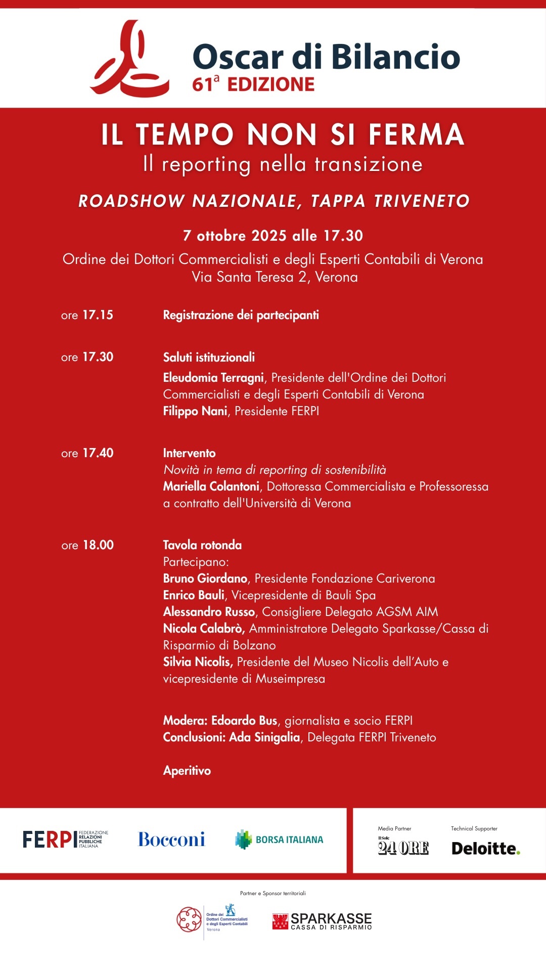 L’appuntamento si è tenuto nella sede dell’Ordine dei Dottori Commercialisti e degli Esperti Contabili di Verona Via Santa Teresa 2, Verona. Al centro, la sfida del reporting come strumento chiave per costruire trasparenza, reputazione e valore condiviso. L’incontro si è aperto con i saluti istituzionali da parte di Eleudomia Terragni, Presidente dell’Ordine dei Dottori Commercialisti e degli Esperti Contabili di Verona, e di Filippo Nani, Presidente FERPI, che hanno introdotto i lavori sottolineando il valore del dialogo tra professionisti, imprese e istituzioni sul tema della rendicontazione. A seguire, l’intervento di Mariella Colantoni, Dottoressa commercialista e docente a contratto dell’Università di Verona, che ha presentato le novità più rilevanti in materia di reporting di sostenibilità, con un focus sugli strumenti e gli standard oggi a disposizione delle organizzazioni.