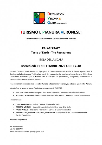 Sono invitati amministratori ed operatori turistici ed economici veronesi, a partire da quelli della Pianura.