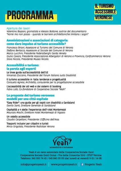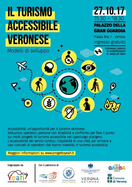 Giungerà alla sua terza edizione, venerdì 27 ottobre al Palazzo della Gran Guardia di Verona (Piazza Bra, 1, ore 15.20-18.30) il convegno intitolato Il turismo accessibile veronese: modelli di sviluppo, organizzato dalla Cooperativa Sociale locale Yeah, ramo aziendale della Cooperativa Sociale Quid, specializzato nella fornitura di servizi per l’accessibilità e l’inclusione.