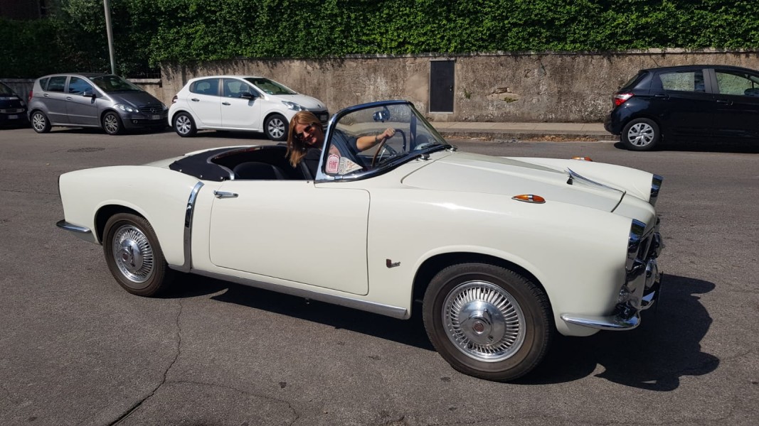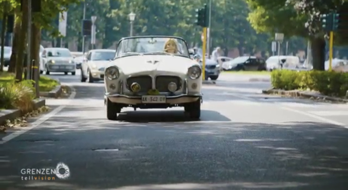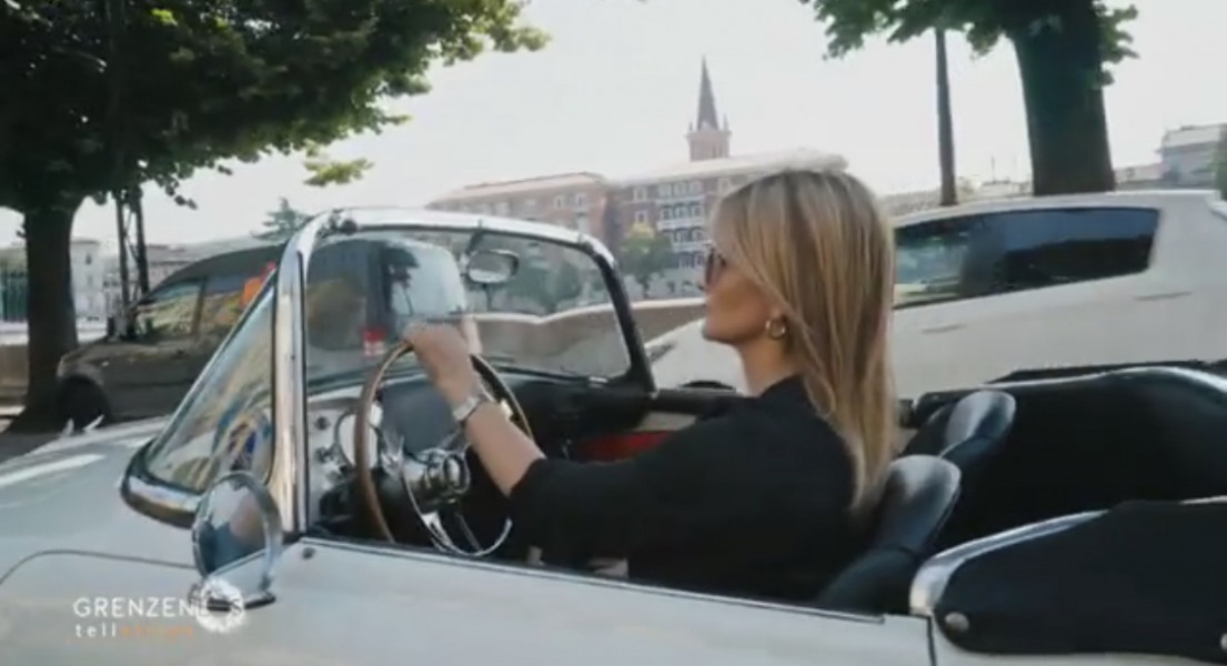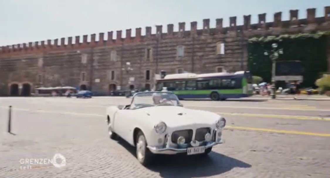 La Fiat 1200 Trasformabile guidata da Silvia Nicolis, protagonista per le vie di Verona per la TV tedesca Grenzenlos SAT1.