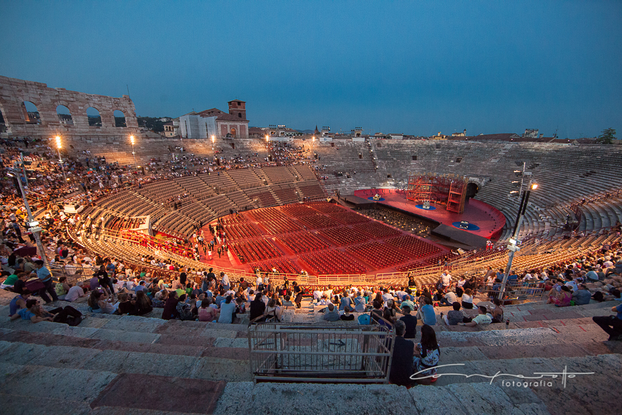 L’Arena, il grandioso anfiteatro romano, uno dei più prestigiosi al mondo fra quelli a noi giunti e probabilmente il meglio conservato. Ogni estate, dal 1913, le sue gradinate accolgono i seicentomila spettatori della più grande stagione lirica del mondo con circa 50 opere a stagione.