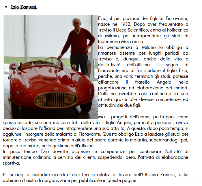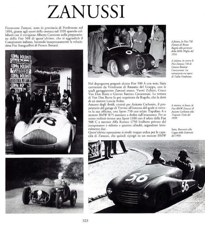 Octane Magazine, 2022 di Massimo Delbò - "...Fioravante Zanussi nacque a Pasiano di Pordenone, nel nord-est dell'Italia, nel giugno del 1894, primo di nove figli e, fin da giovanissimo, dimostrò un profondo amore per tutto ciò che riguardava la meccanica. Non è l'unico, perché anche quattro dei suoi fratelli finiranno per lavorare con le automobili. A soli 16 anni era già a Torino, a lavorare per l'Anonima Aquila Italiana, un'azienda che produceva auto e motori con il marchio Aquila.Poco dopo passa alla decisamente più grande e affermata S.C.A.T. (Società Ceirano Automobili Torino) e viene assegnato al reparto corse. È ora importante ricordare un aspetto spesso dimenticato: nei primi anni del Novecento, i fratelli Ceirano sono stati le principali forze spirituali e innovative del crescente panorama motoristico italiano e il loro contributo allo sviluppo delle automobili italiane dell'epoca è incommensurabile. Le S.C.A.T. vinsero la Targa Florio nel 1911, 1912 e 1914 e lo stesso Tazio Nuvolari, prima della Prima Guerra Mondiale, distribuiva le loro auto nel Veneto. Il giovane Fioravante, appassionato, talentuoso e volenteroso, trova l'humus giusto dove far crescere le sue conoscenze ed esperienze. Nel 1914, viene assunto alla FIAT, come specialista della sala prove motori ma, poco dopo, l'Italia entra nella Prima Guerra Mondiale e lui viene arruolato come staffetta di corsa per motociclette..."
